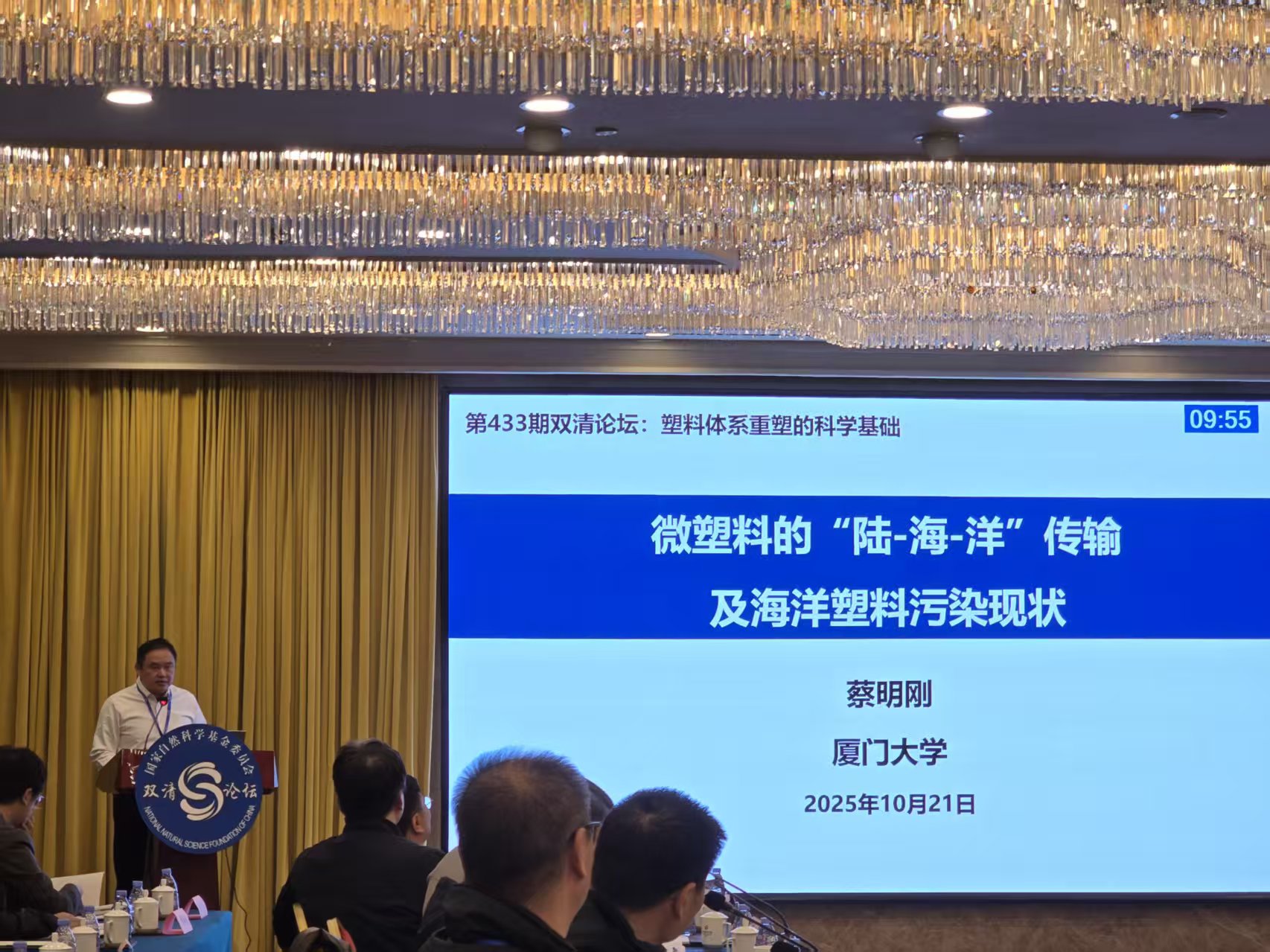 2025年10月21—22日,课题组蔡明刚教授应邀参加自然科学基金委第433期双清论坛,于“塑料的可持续发展-重塑塑料体系”分会场上作题为《微塑料的“陆-海-洋”传输及海洋微塑料污染现状》的专题汇报,从多尺度跨介质迁移的视角,系统阐释了微塑料从陆地到海洋的传输路径与累积特征,为理解塑料污染的全局循环机制提供了重要科学参考。